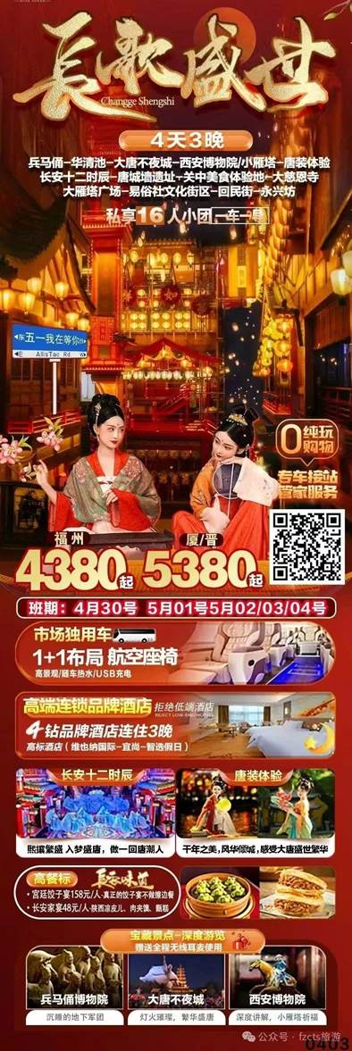 兵马俑、华清池、西安博物馆、大唐不夜城、长安十二时辰、易俗社文化街区、钟鼓楼回民小吃街、大慈恩寺、大雁塔广场、永兴坊双飞4日游